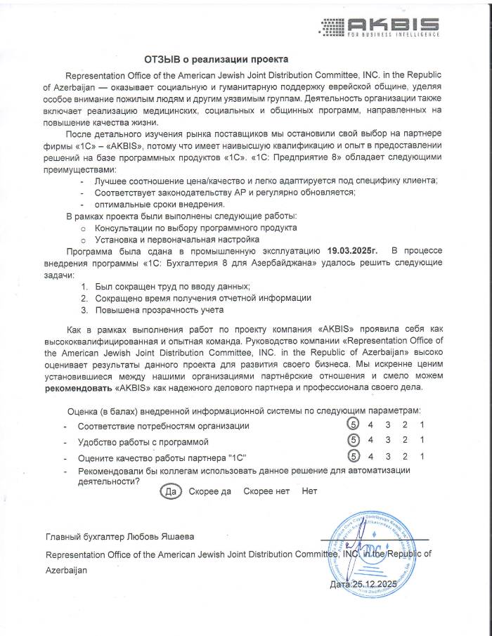 ОТЗЫВ о реализации проекта Representation Office of the American Jewish Joint Distribution Committee, INC. in the Republic of Azerbaijan — оказывает социальную и гуманитарную поддержку еврейской общине, уделяя особое внимание пожилым людям и другим уязвимым группам. Деятельность организации также включает реализацию медицинских, социальных и общинных программ, направленных на повышение качества жизни. После детального изучения рынка поставщиков мы остановили свой выбор на партнере фирмы «1С» – «AKBIS», потому что имеет наивысшую квалификацию и опыт в предоставлении решений на базе программных продуктов «1С». «1С: Предприятие 8» обладает следующими преимуществами: - Лучшее соотношение цена/качество и легко адаптируется под специфику клиента; - Соответствует законодательству АР и регулярно обновляется; - оптимальные сроки внедрения. В рамках проекта были выполнены следующие работы: o Консультации по выбору программного продукта o Установка и первоначальная настройка Программа была сдана в промышленную эксплуатацию 19.03.2025г. В процессе внедрения программы «1С: Бухгалтерия 8 для Азербайджана» удалось решить следующие задачи: 1. Был сокращен труд по вводу данных; 2. Сокращено время получения отчетной информации 3. Повышена прозрачность учета Как в рамках выполнения работ по проекту компания «AKBIS» проявила себя как высококвалифицированная и опытная команда. Руководство компании «Representation Office of the American Jewish Joint Distribution Committee, INC. in the Republic of Azerbaijan» высоко оценивает результаты данного проекта для развития своего бизнеса. Мы искренне ценим установившиеся между нашими организациями партнёрские отношения и смело можем рекомендовать «AKBIS» как надежного делового партнера и профессионала своего дела. Оценка (в балах) внедренной информационной системы по следующим параметрам: - Соответствие потребностям организации 5 4 3 2 1 - Удобство работы с программой 5 4 3 2 1 - Оцените качество работы партнера "1С" 5 4 3 2 1 - Рекомендовали бы коллегам использовать данное решение для автоматизации деятельности? Да Скорее да Скорее нет Нет Главный бухгалтер Любовь Яшаева ______________________ Representation Office of the American Jewish Joint Distribution Committee, INC. in the Republic of Azerbaijan Дата:25.12.2025
