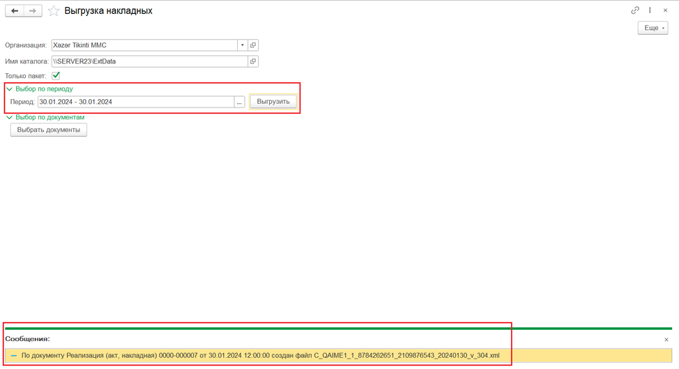 После заполнения всех требуемых реквизитов и выбора необходимого периода для выгрузки накладных следует нажать кнопку «Выгрузить». По завершении процесса появится информационное сообщение, подтверждающее, что выгрузка успешно выполнена.